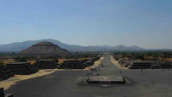 古城的死者大道是一条宽40米的笔直的大路,大多数纪念物都矗立在其两侧,其中气势最恢宏的太阳金字塔(底座225×222米)是世界第三大金字塔。它挺立在大道东侧,高达63米(原来的高度是75米),体积有一百万立方米,是遗址中规模最大的建筑物。金字塔为了举行宗教仪式而建。每年两次,太阳正好位于金字塔的正上方,耀眼的阳光幻化成背景,映衬得整座神庙熠熠生辉,这种景象应该是经过特奥蒂瓦坎人的精密计算的。