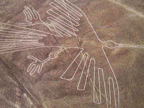 整个谷地布满了由宽窄不一的“沟”组成的三角形、长方形、平行四边形、菱形和螺旋形等几何图形。它们又分别组成蜘蛛、蜂鸟、猴子、蜥蜴、章鱼、老鹰、海鸥、树木以及仙人掌等动植物的轮廓图,甚至还有类似外星人的形象出现。每个图案竟有几百平方米之大。而最大的一个占地5平方公里。一只大鹏展开的翅膀就有50米之长,而鸟身子长度达300米。这些图案不仅层次分明,而且间隔适度,有些相同的图案简直象一个模子里印出来的,其精确度令人吃惊。