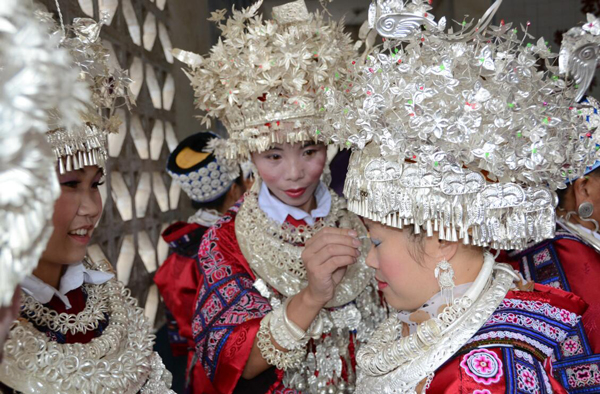 其实苗族人佩带银饰的习俗是自古就有的,也是一种传统风俗。主要有三种作用,第一当然是打扮自己,特别是姑娘门,当然希望自己漂漂亮亮的。第二是往年的时候,社会动荡不安,苗族人经常要迁徙,而身上带着银饰,即做到了“人走家随”。第三是避邪,苗族人都相信银器有驱邪保平安的作用,戴在自己的身上,以求平安。大家常见的电视古代片中,特别是武侠片中,动不动就拿银针试毒。而银遇身体有风湿或有毒时会发灰,这样苗族人就能够随时把握自己的身体状况,方便及时就医。