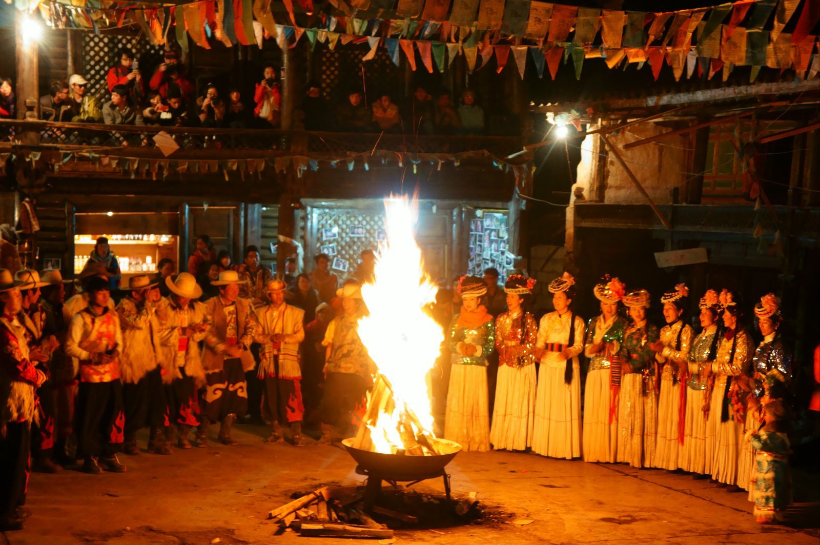纳西族新年篝火晚会是丽江古城最受欢迎的传统活动之一。不管是熟悉人还是陌生人,都会围坐在冬日熊熊的篝火边,吃着纳西族特色的食物,手牵着手,唱歌、跳舞、喝酒、聊天……放开心胸,举杯对月,把酒言欢。