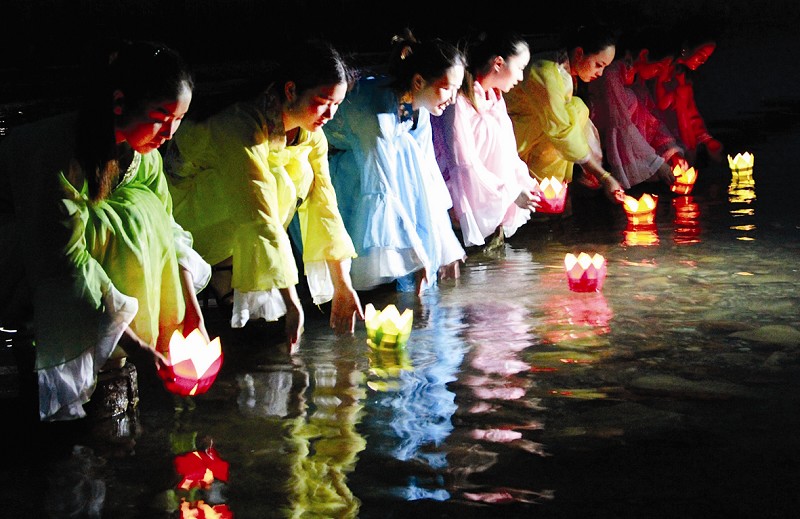 新春放河灯是一道亮丽的人文风景线。丽江放河灯的传统,发源于丽江古城小桥流水的建筑风格。看,小河四处穿梭着,为放河灯提供了良好的场所。每年春节,纳西人都会亲手制作精美的河灯,绿叶红花衬托着灯心一点红,煞是可爱!随着人流来到古城小桥边,许下自己和家人的心愿,以及对新来临的一年美好生活的希望和祝福,再将河灯缓缓地放入流淌的溪水中,愿望就会实现。